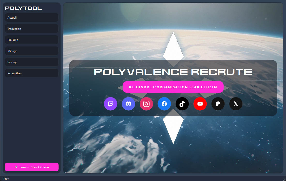 PolyTool est l’assistant indispensable pour tous les explorateurs de Star Citizen. Conçu par Gerby pour l’organisation Polyvalence, il réunit en une seule application tout ce dont vous avez besoin pour optimiser vos sessions : traduction en français, analyse de prix UEX, affichage du grade des composants, outil de minage et salvage. Simple, rapide et conçu pour la performance.